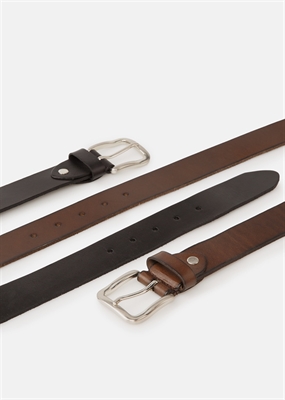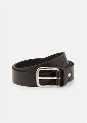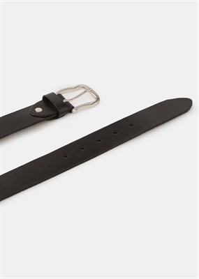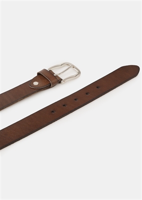 Cinturón de piel con cierre de hebilla metálica y trabilla.