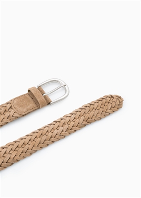Cinturón trenzado de serraje con trabilla y cierre de hebilla metálica.