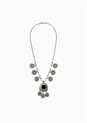 Collar con colgantes de monedas y abalorio con cristal facetado. Cierre de cadena y mosquetón.