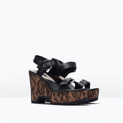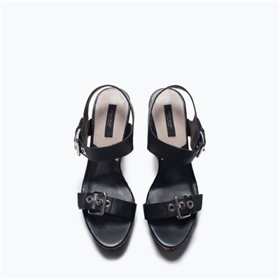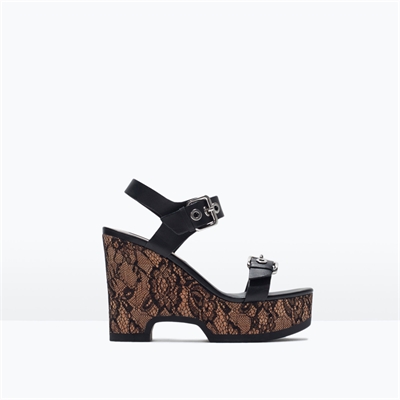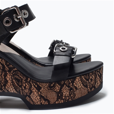 Cuña piel acabado nappa. Color negro. Detalle encaje en planta. Cierre mediante hebilla al tobillo. Altura del tacón 11 cm.