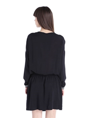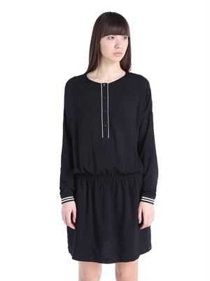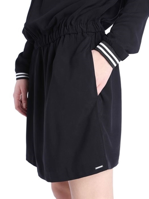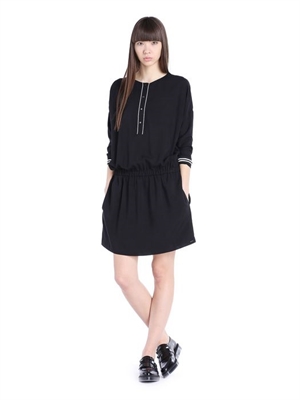 Scoop neck, long sleeves, elastic waistband, button details, rib knit cuffs.