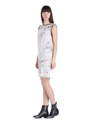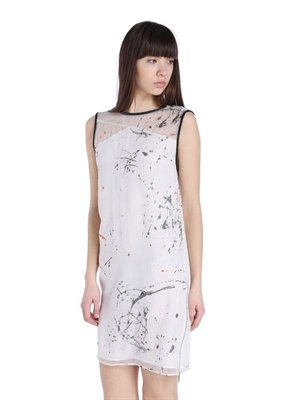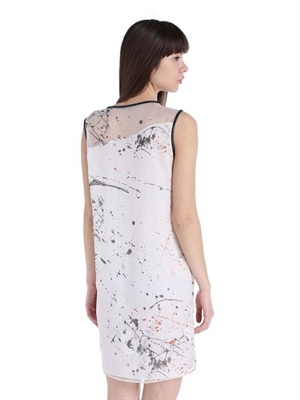 Chic and airy sleeveless viscose/georgette dress with a paint splatter print and leather detail on the collar and armholes. An exaggerated zipper detail along the side gives it a rock attitude.