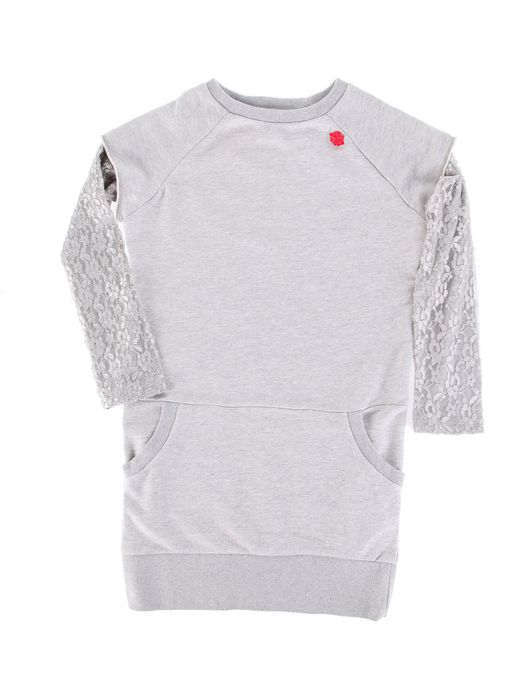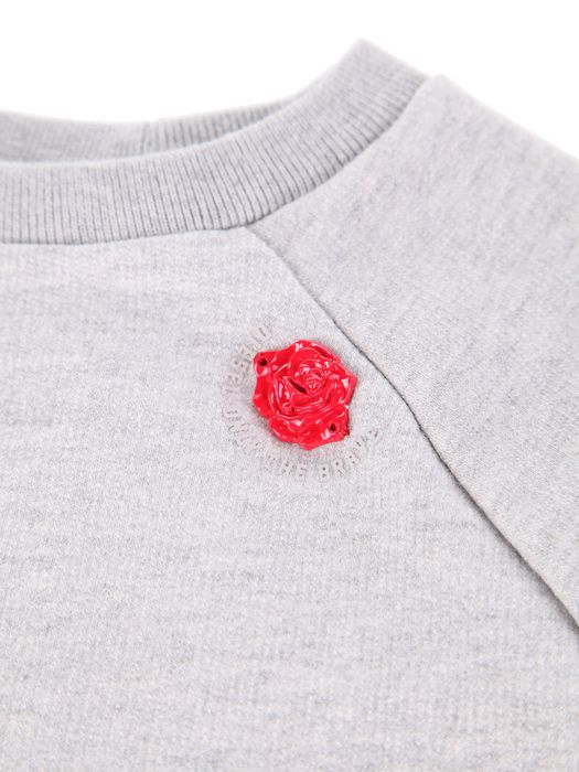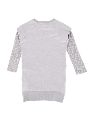Crew neck, long sleeves, side pockets, rib knit cuffs and hem, sweater fabric with a metal rose detail and lace sleeves.