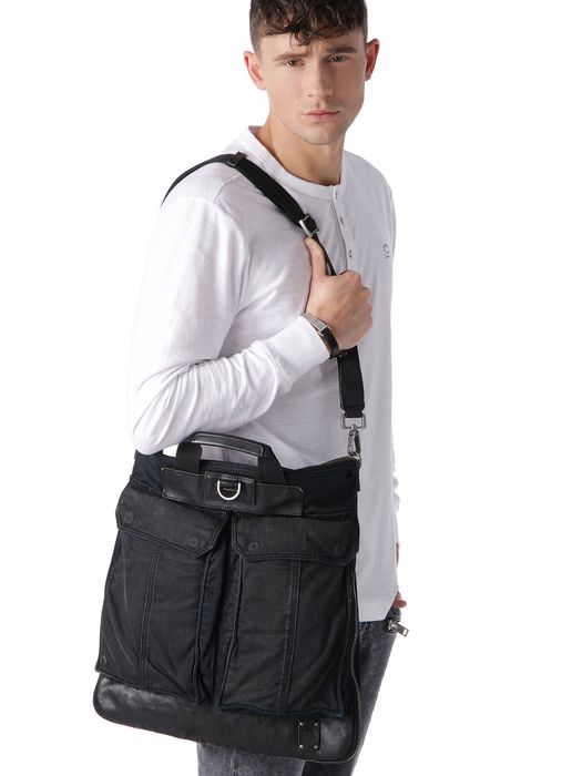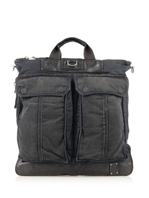 Inspired by the Helmet bag, the garment washing on this piece ensures that no two are the same.Front pockets, denim & leather, shoulder bag, adjustable shoulder strap, logo detail, Suitable for Ipad 2 and new Ipad.This item's measurements are:Lenght 42 cm/ 16,5 inHeight 44,5 cm/ 17,5 inWidth 4 cm/ 1,5 in