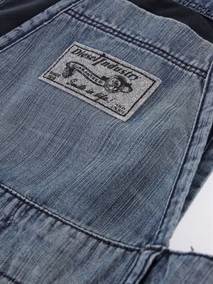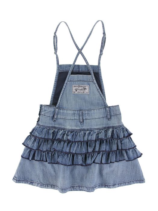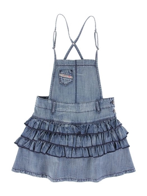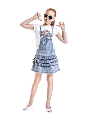 Scoop neck, treated light blue denim, buttoned opening, single chest pocket, ruffles details.