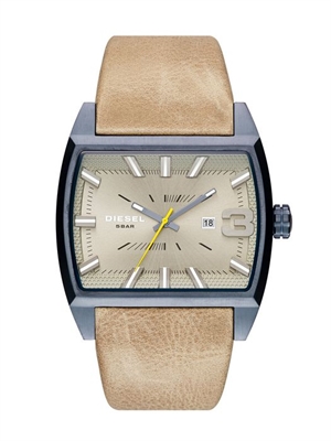 Pairing a light brown leather strap with a blue-plated stainless steel case and taupe sunray dial, Diesel's Starship boasts both bold design and everyday versatility. Case Size: 47 x 52 mmCase Thickness: 12 mmWater Resistance: 5 ATMCase Material: Stainless-SteelCase Finish: Brushed, PolishedAttachment Material: LeatherAttachment Color: BrownDial Color: Beige