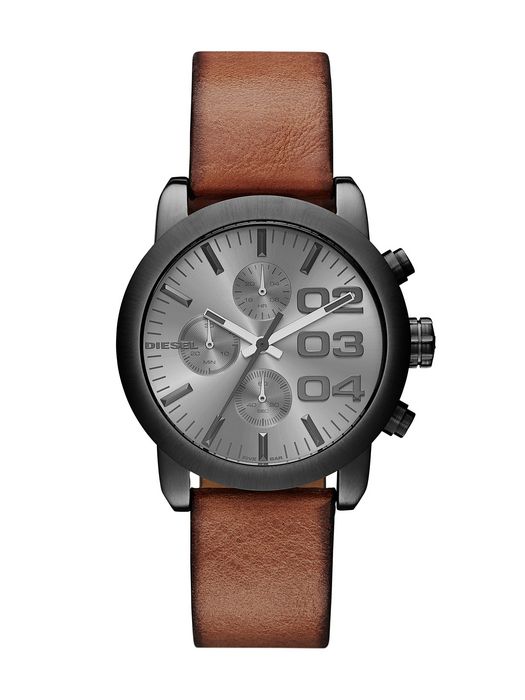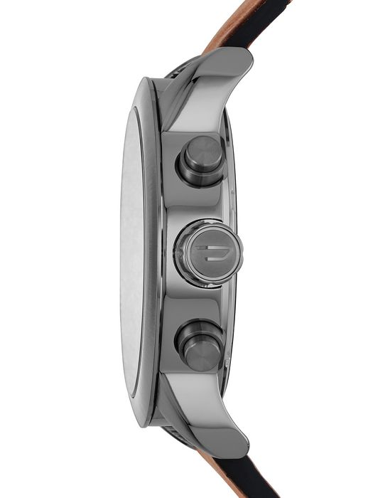 Blending a light brown leather strap with gunmetal plating and a chronograph dial, this bold rendition of Diesel's Flare collection delivers attitude with a stylish touch.Case Size: 40 X 46 mmCase Thickness: 10 mmWater Resistance: 5 ATMCase Material: Stainless-SteelCase Finish: Brushed, PolishedAttachment Material: LeatherAttachment Color: BrownDial Color: Gray