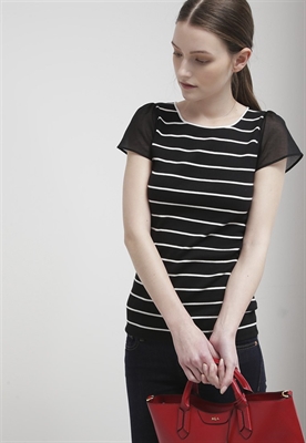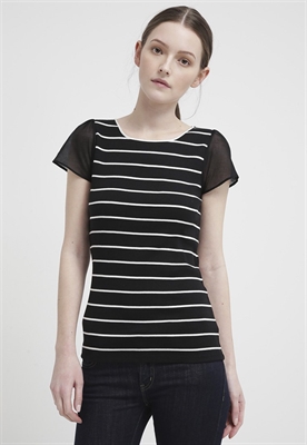 Largo:normalAjuste:ceñidosMaterial/composición:tejido de puntoModelo, altura:178 cm, lleva la talla 38Cuello/escote:cuello redondoOcasión:tiempo libreEstampado:de rayasLargo de la prenda:61 cmLargo de manga:manga extracortaMaterial exterior:100% algodónCuidados:no utilizar secadora, lavar a máquina a 30°CNúmero de artículo:L4221D05S-Q11