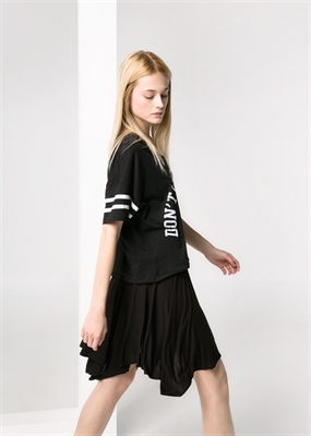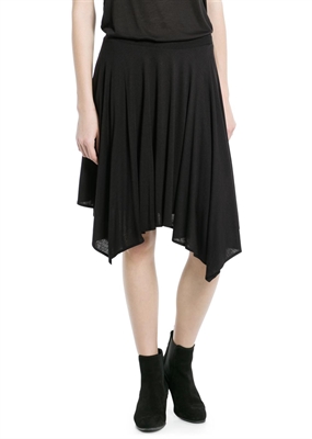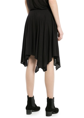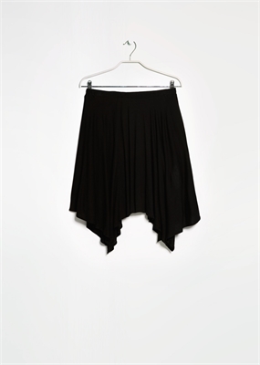 Falda asimétrica de vuelo con cintura elástica, terminaciones en pico y forro interior.