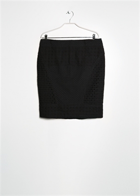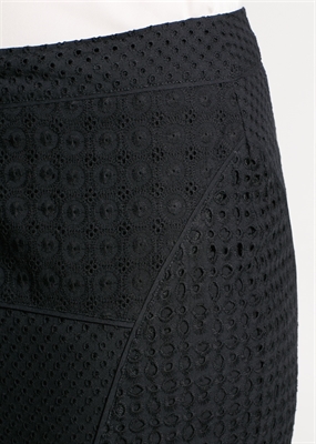 Falda de algodón con bordados suizos combinados. Cierre de cremallera y gancho en la parte posterior, abertura y forro interior.