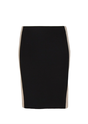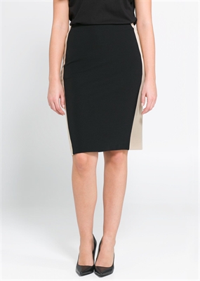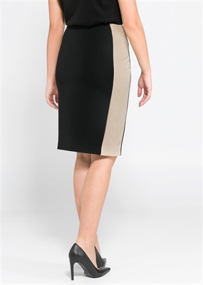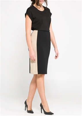 Falda entallada bicolor con paneles laterales en contraste. Cierre de cremallera y gancho lateral, forro interior.