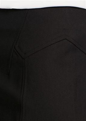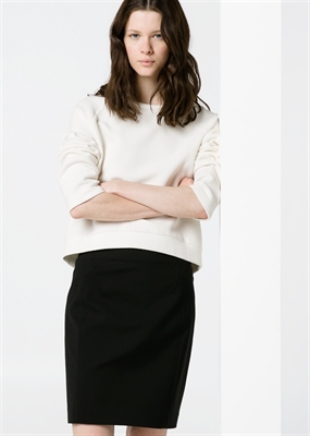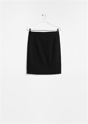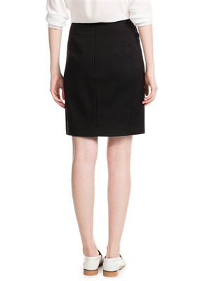 Falda entallada confeccionada en tejido elástico de algodón. Costuras decorativas y cierre de cremallera y gancho en la parte posterior.