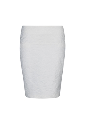 Falda entallada de tiro alto en tejido jacquard con diseño barroco. Dos bolsillos laterales, cierre de cremallera y abertura en la parte posterior y forro interior.