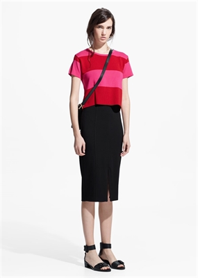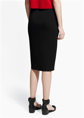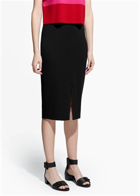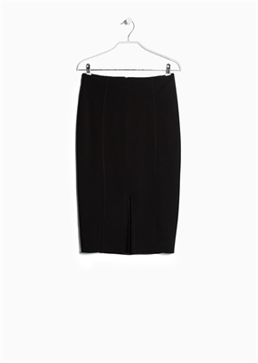 Falda lápiz confeccionada en tejido elástico con abertura en la parte delantera. Cierre oculto de cremallera en la parte posterior y forro interior.