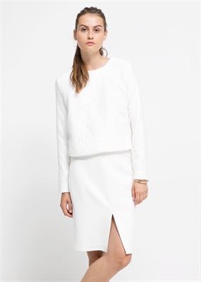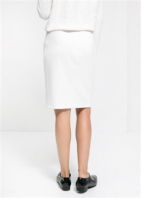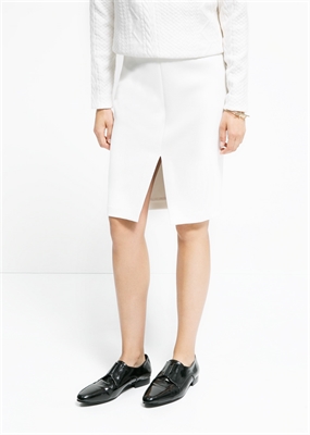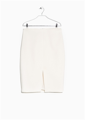 Falda lápiz en tejido elástico con abertura en la parte frontal del bajo. Cierre de cremallera y gancho en la parte posterior, forro interior.