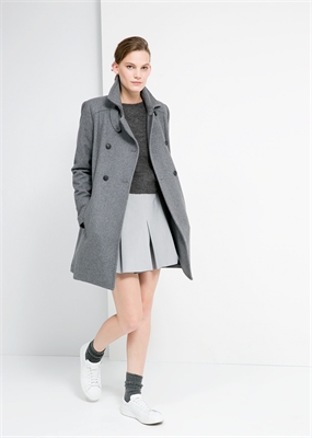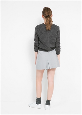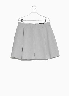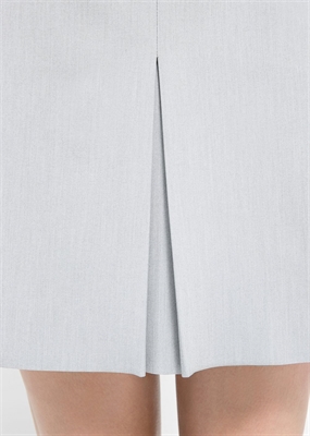 Falda de pinzas confeccionada en tejido elástico con pliegues decorativos. Dos bolsillos laterales, cierre de cremallera y gancho en la parte posterior.
