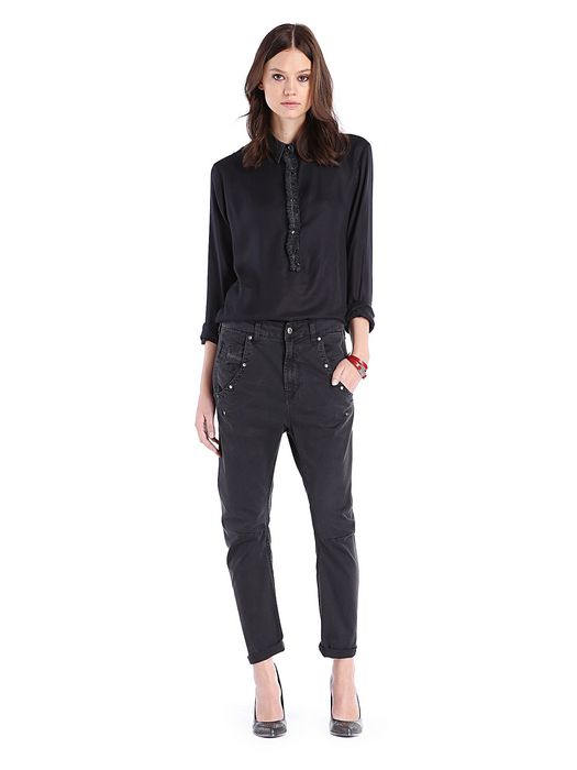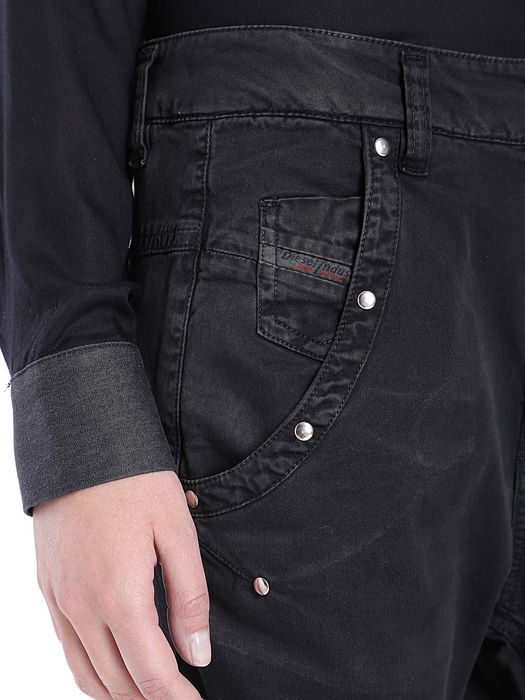 Buttoned opening, side pockets, studs details, belt loop waistband.