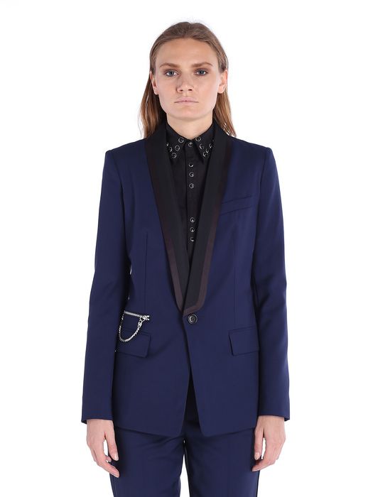 Tailored single-breasted jacket in tropical cool wool with flap pockets and pocket with zipper and chain detail on right side. Lapel in satin and faille in contrast color.