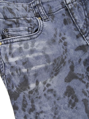 Five pocket set, dyed fabric with jaquard, logo detail.