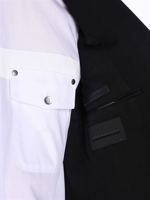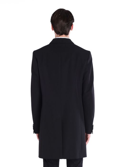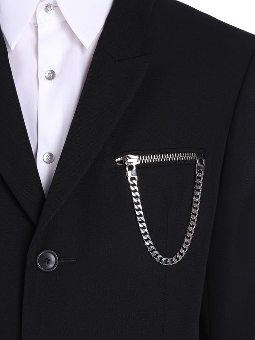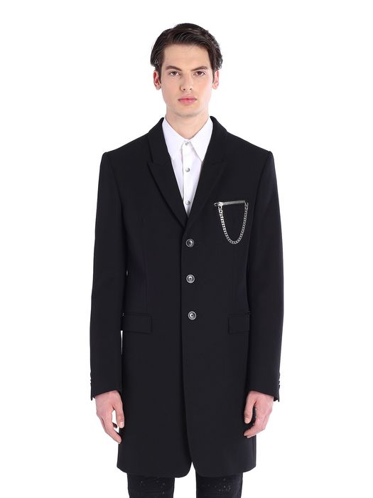 Structured compact wool trench with zips details. Ornamental chain on the pocket.