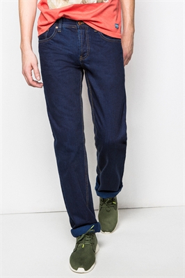 Pantalón denim 5 bolsillos básico recto en azul tinta. Desarrollado en un lavado oscuro suave con arrugas en el muslo. Cierre bragueta con botones. Proceso H20. Straight fit.