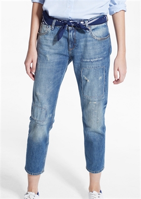 Jeans boyfriend cropped en lavado vintage claro con rotos decorativos y parches. Pañuelo desmontable a la cintura, cinco bolsillos, trabillas, cierre de cremallera y botón.
