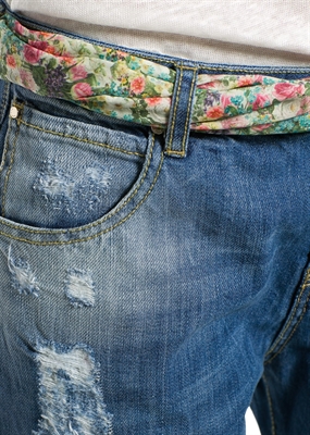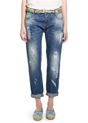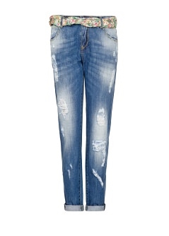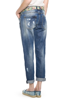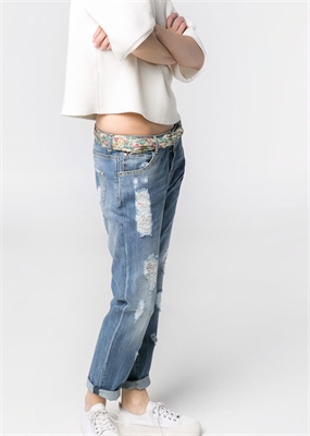 Jeans boyfriend en lavado medio con lazo desmontable de estampado floral. Rotos decorativos, cinco bolsillos, trabillas, cierre de cremallera y botón.