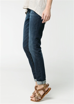 Jeans super slim de tiro alto en lavado oscuro desgastado. Cinco bolsillos, trabillas, cierre de cremallera y botón.