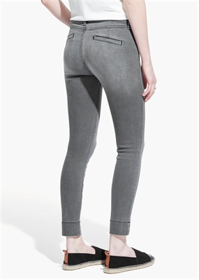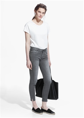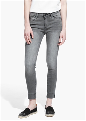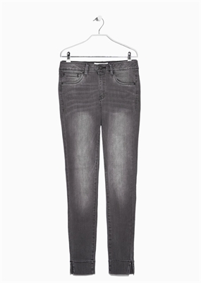 Jeans skinny cropped de color gris con tres bolsillos laterales y dos bolsillos de ribete en la parte posterior. Tiro medio, trabillas, cierre de cremallera y botón, aberturas laterales en el bajo.