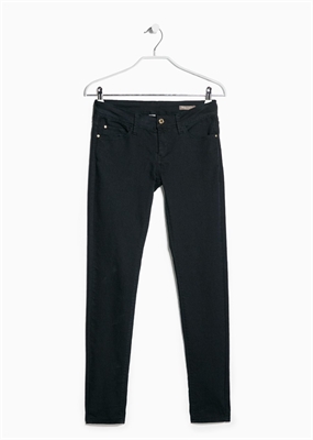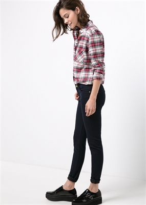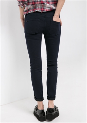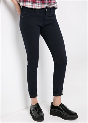 Jeans skinny de tiro medio en color navy. Cinco bolsillos, trabillas, cierre de cremallera y botón.