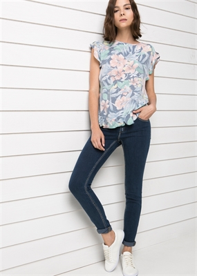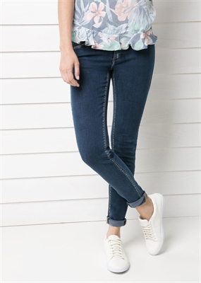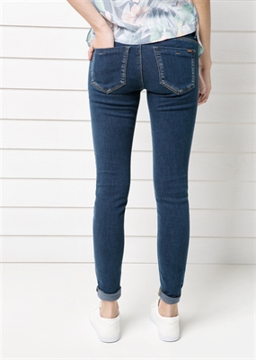 Jeans skinny de tiro medio en lavado oscuro. Cinco bolsillos, trabillas, cierre de cremallera y botón.