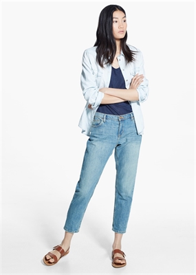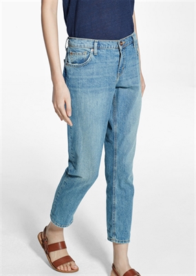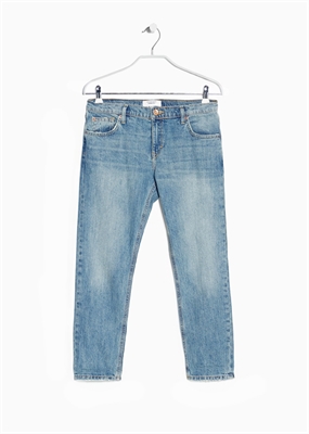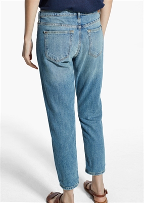 Jeans slim cropped en lavado vintage. Tiro medio, cinco bolsillos, trabillas, cierre de cremallera y botón.