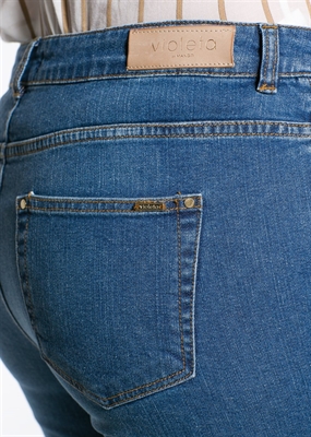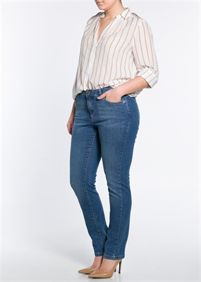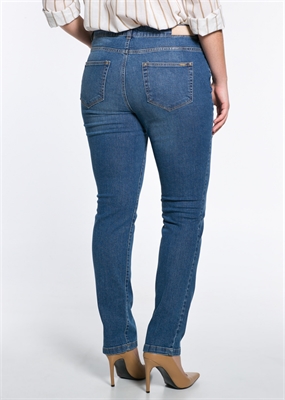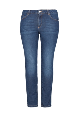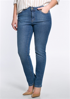 Jeans slim en lavado medio de tiro medio. Cinco bolsillos, trabilla, cierre de cremallera y botón.