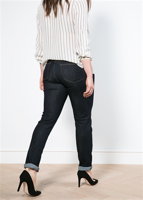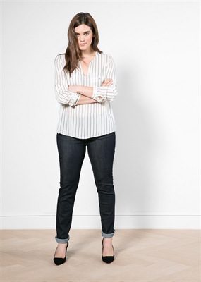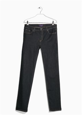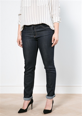 Jeans slim de tiro medio en color oscuro desgastado. Cinco bolsillos, trabillas, cierre de cremallera y botón.