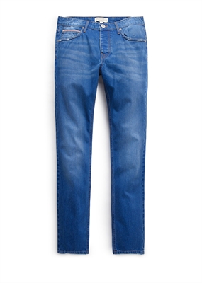 Jeans slim-fit Premium en color tinta desgastado que pertenecen a la colección denim con ribete decorativo. Cinco bolsillos, trabillas, bajo de 18 centímetros y cierre de botones.