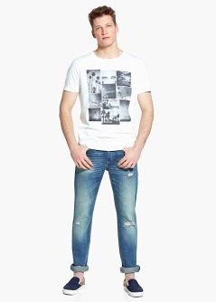 Jeans slim-fit en lavado vintage claro con rotos decorativos que pertenecen a la colección denim. Cinco bolsillos, trabillas, bajo de 18 centímetros, cierre de botones.