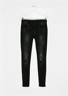 Jeans super slim negros de tiro medio con rotos decorativos. Cinco bolsillos, trabillas, cierre de cremallera y botón.
