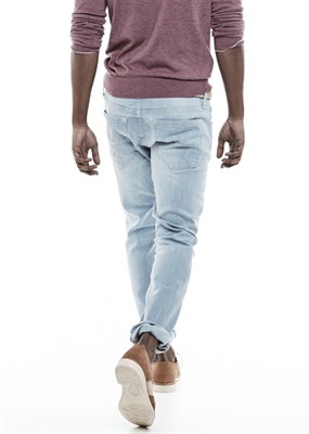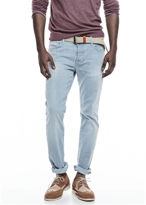 Jeans slim-fit confort en lavado claro que pertenecen a la colección denim. Cinco bolsillos, trabillas bajo de 17 centímetros y cierre de botones.