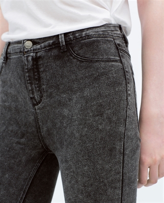 Pantalón denim tipo jegging tro alto skinny fot largo tobillero, efecto nevado. ALTURA MODELO 177 CM