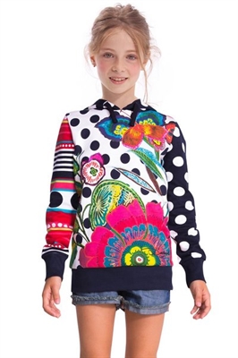 Las niñas más coquetas adorarán esta sudadera. Y a ti te encantará por ser 100% de algodón y muy cómoda. Los topos mezclados con flores la hacen muy divertida, y la capucha es rosa por dentro. ¡No se podrá resistir!