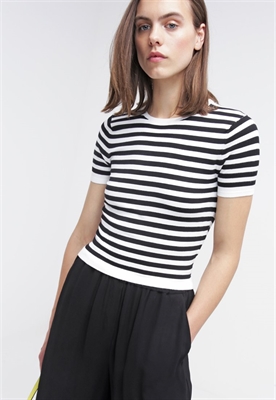 Largo:cortaModelo, altura:181 cm, lleva la talla 36Cuello/escote:cuello redondoEstampado:de rayasLargo de la prenda:49 cmLargo de manga:cortaMaterial exterior:76% viscosa, 24% poliésterCuidados:lavar a mano, se puede lavar en secoNúmero de artículo:DK121D00O-A11