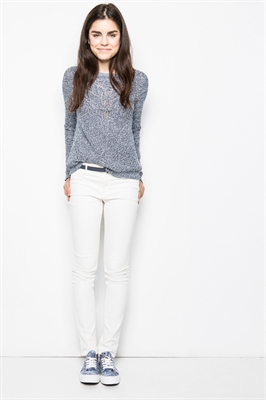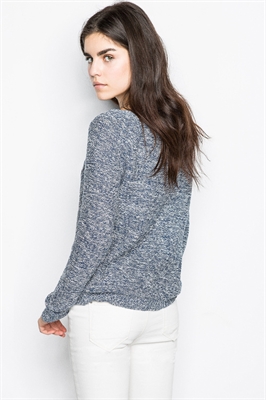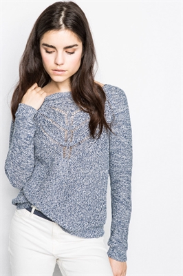 Jersey de manga larga, con cuello redondo, realizado en punto perlado con hilo torzal, con detalle calado en la parte delantera.
