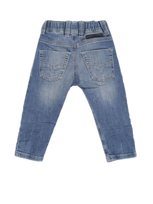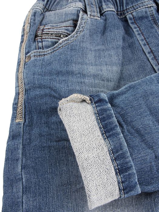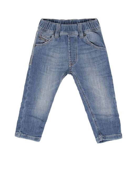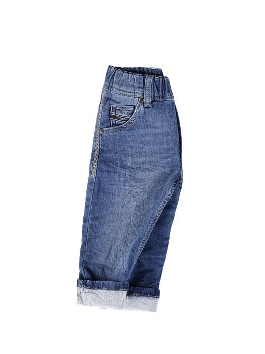 Five pocket set, light blue sweat denim fabric, logo detail.