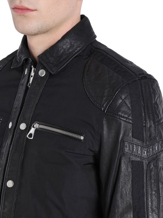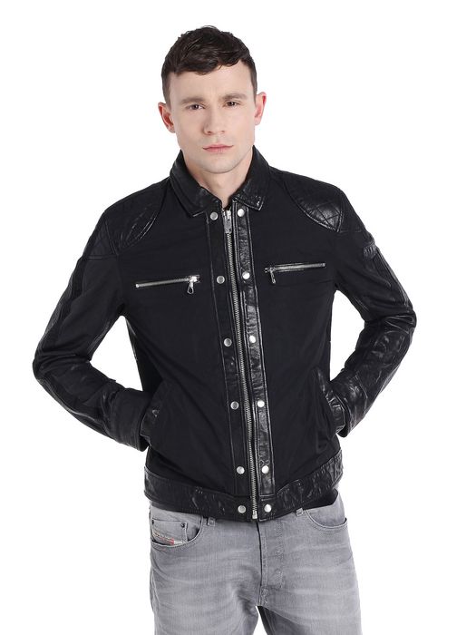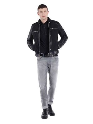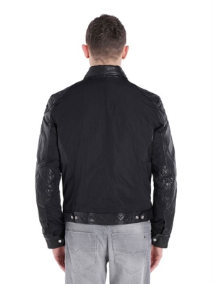 Mix material leather jacket with memory poly nylon on body.Polo collar, zip/zipped opening, side pockets, two zip front pockets, button details.