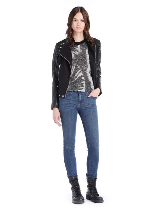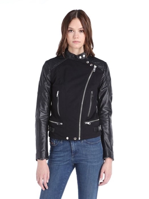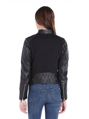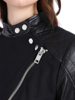 A feminine moto jacket in mix material sheep leather and cotton fleece. The asymmetric front zip, and stitching detail on shoulders and elbows give it a fresh new take. Long sleeves, zip/zipped opening, four front pockets.