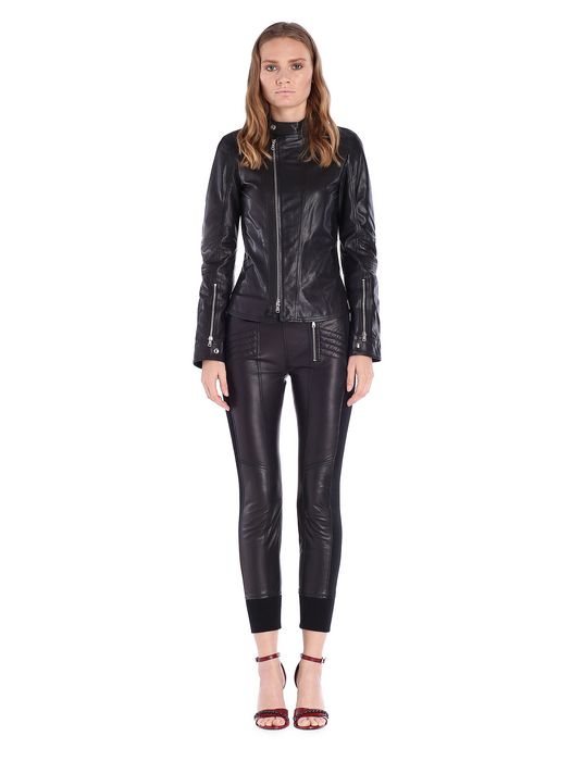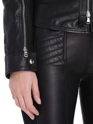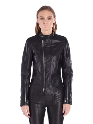 Fitted light lamb leather shirt-jacket with biker collar, zippers on front and cuffs and stitched details on back.