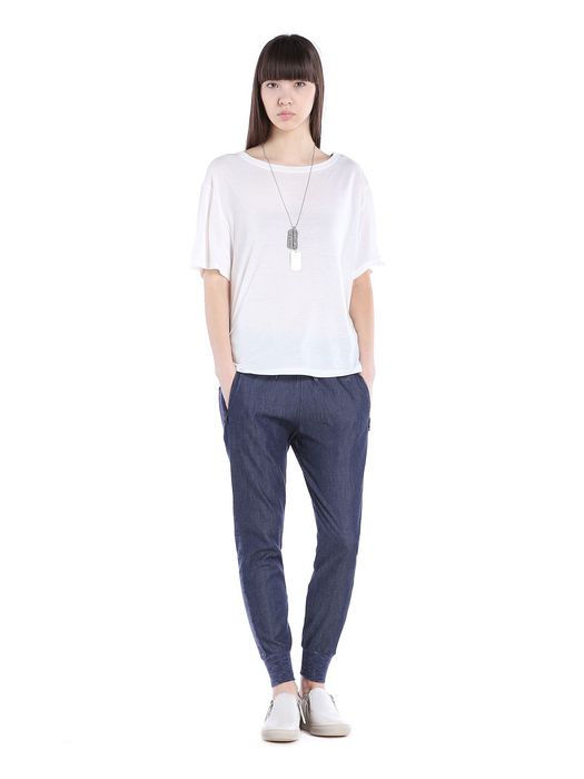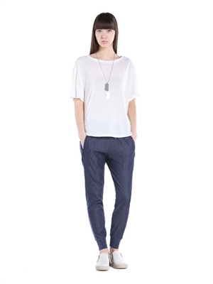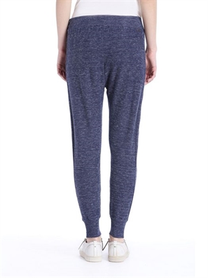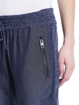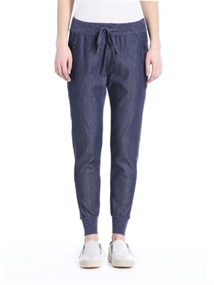 Coulisse, elastic waistband, side zip pockets, elastic ankle cuffs.