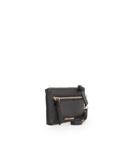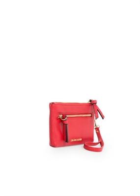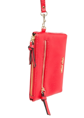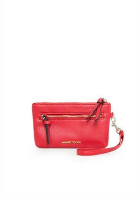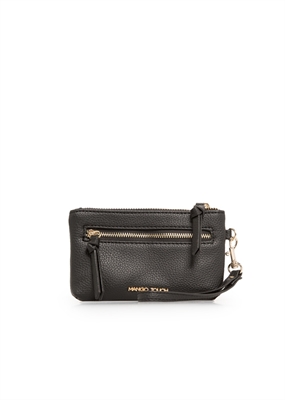 Monedero en efecto piel abatanada con cierre de cremallera superior, bolsillo de cremallera en la parte delantera y pulsera desmontable.