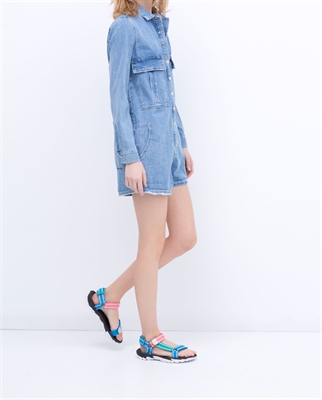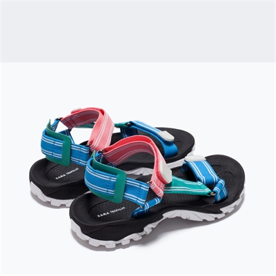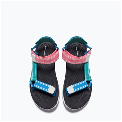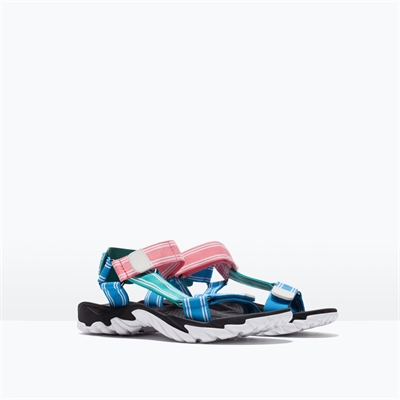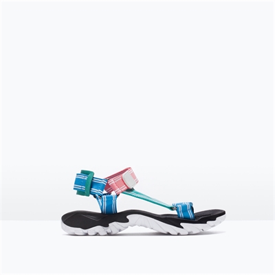 Sandalia plana multicolor. Detalle de tiras en empeine. Suela track bicolor. Cierre mediante tira con velcro al tobillo.Altura de la suela 1 cm.