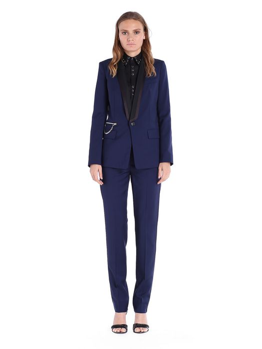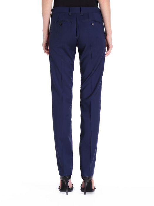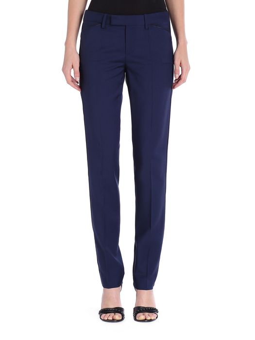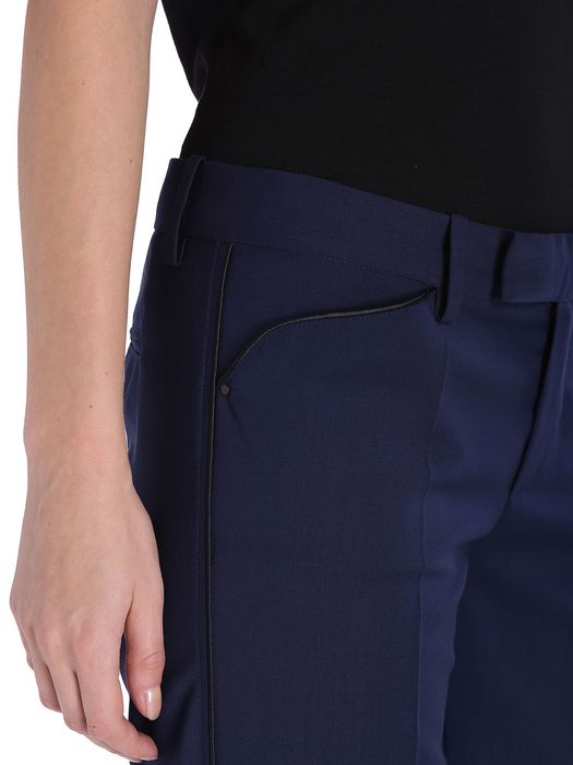 Fine tropical cool wool masculine style pant with welt pockets on back and contrast satin piping along the leg sides and around the frontal pockets opening.